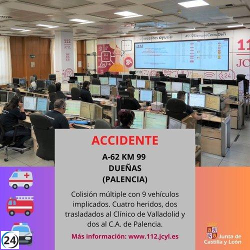 Cuatro personas lesionadas en choque en cadena en la A-62 en Dueñas.