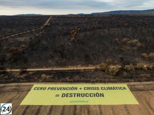 Greenpeace exhibe gran pancarta en León pidiendo acción efectiva contra incendios.